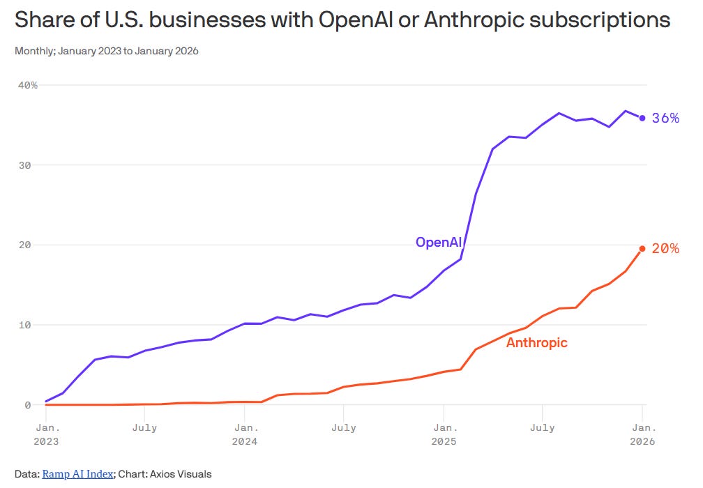 According to Ramp’s data as of February 11th, 16% of businesses pay for both OpenAI and Anthropic. A year ago it was 8%.