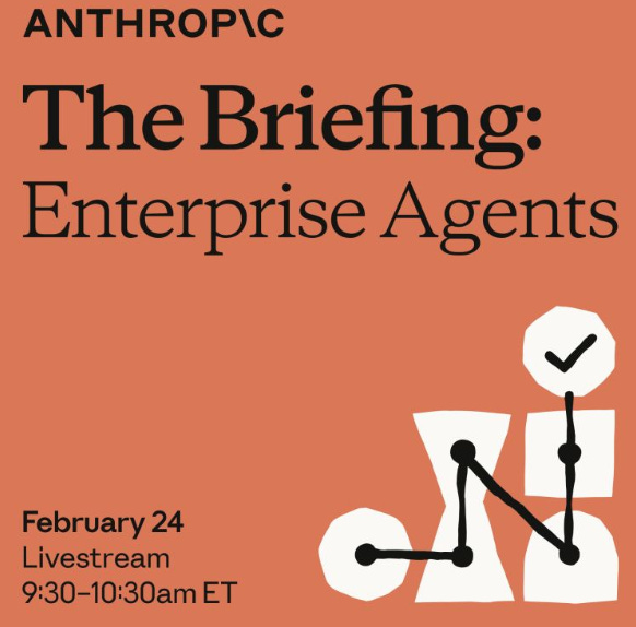 Join Anthropic on Tuesday, February 24 for The Briefing: Enterprise Agents, a livestreamed event where we'll demonstrate how Cowork and Plugins help legal, sales, finance, and data teams build new products and solutions.
