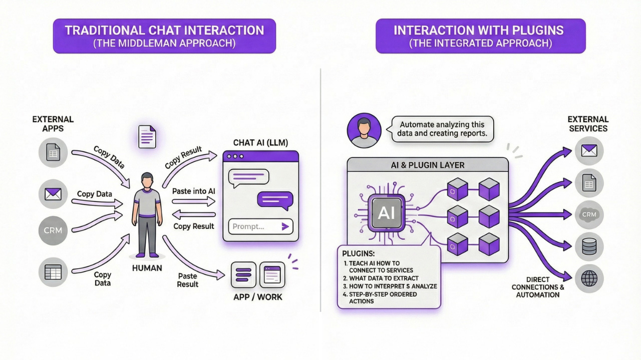 The best part is that multiple plugins work together in the same conversation. Your tools communicate with each other because they’re all tied to an AI that sees everything inside all of them. You describe what you need, and the AI handles the connections.
