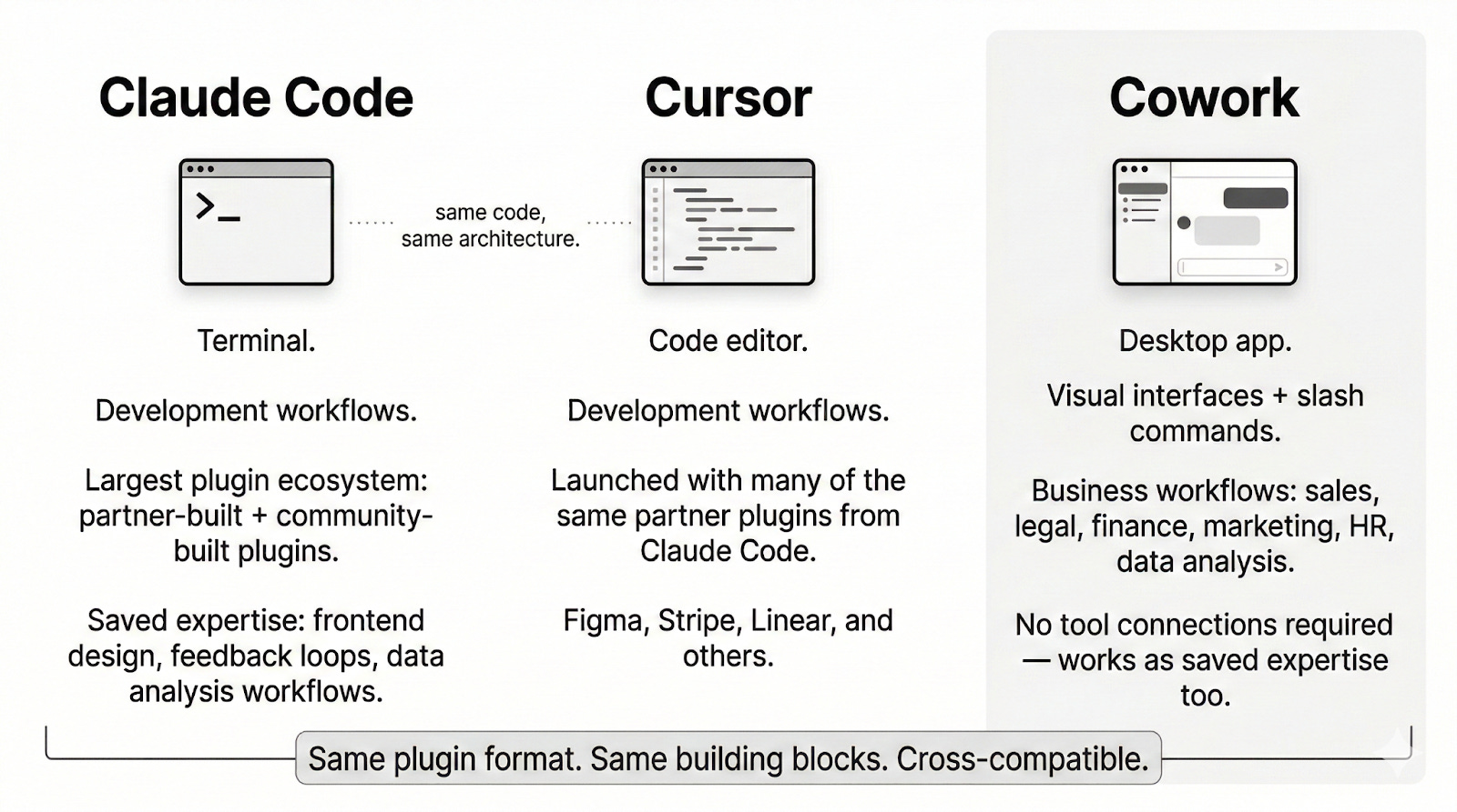 How Cursor, Claude Code, and Cowork plugins compare