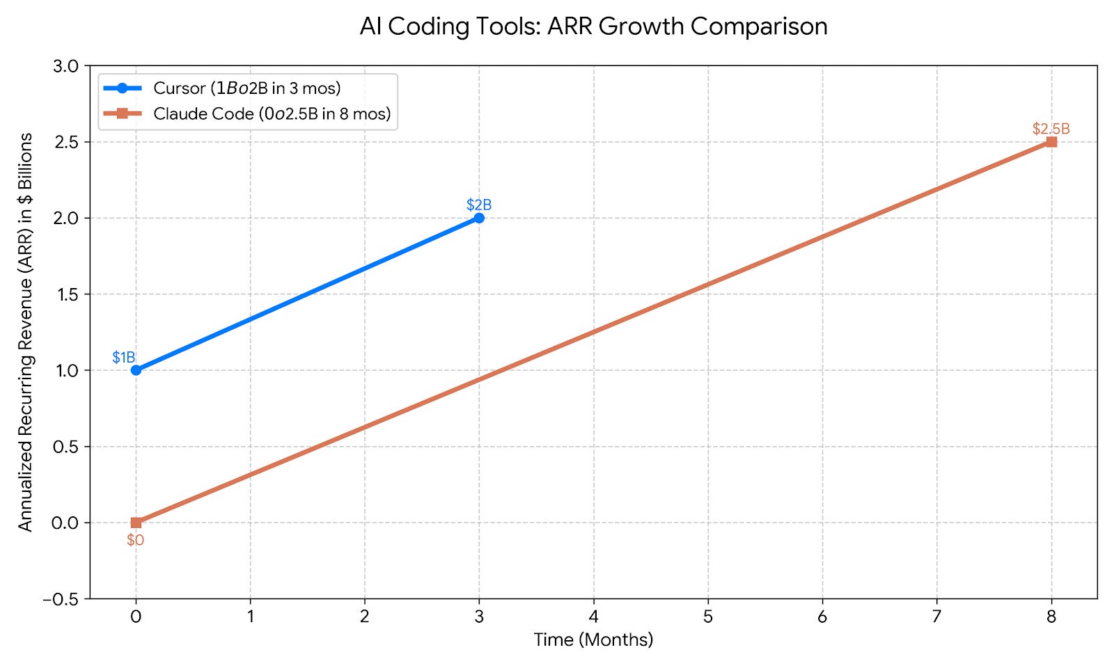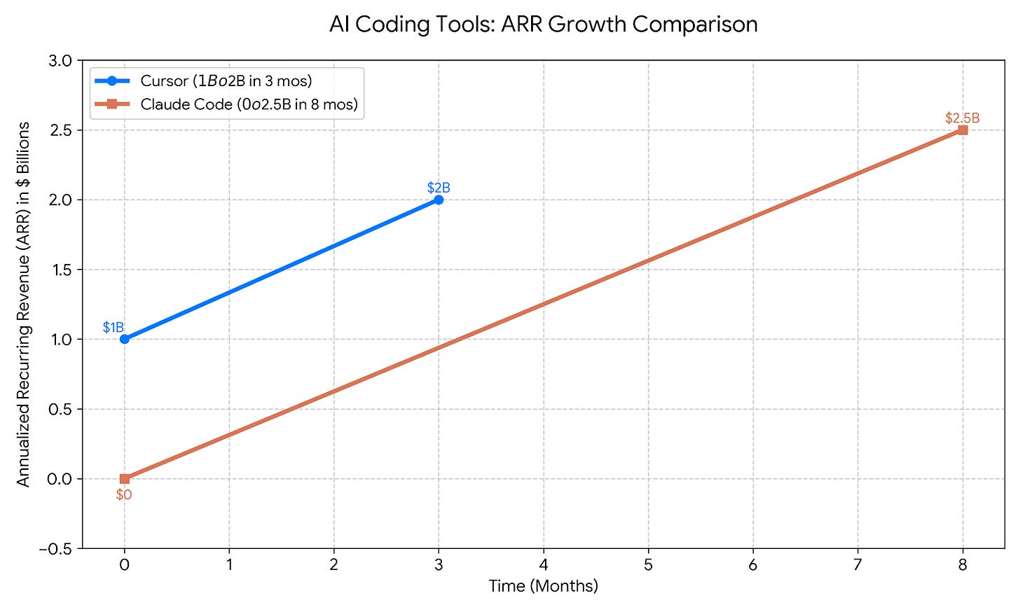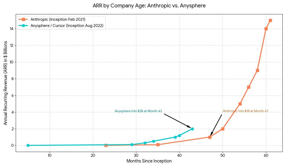 I see a scenario where Anysphere becomes Anthropic’s key competitor. Think about it, Cursor goes from $1B to $2B in 3mos, while Claude Code went $0 to $2.5B in 8mos.