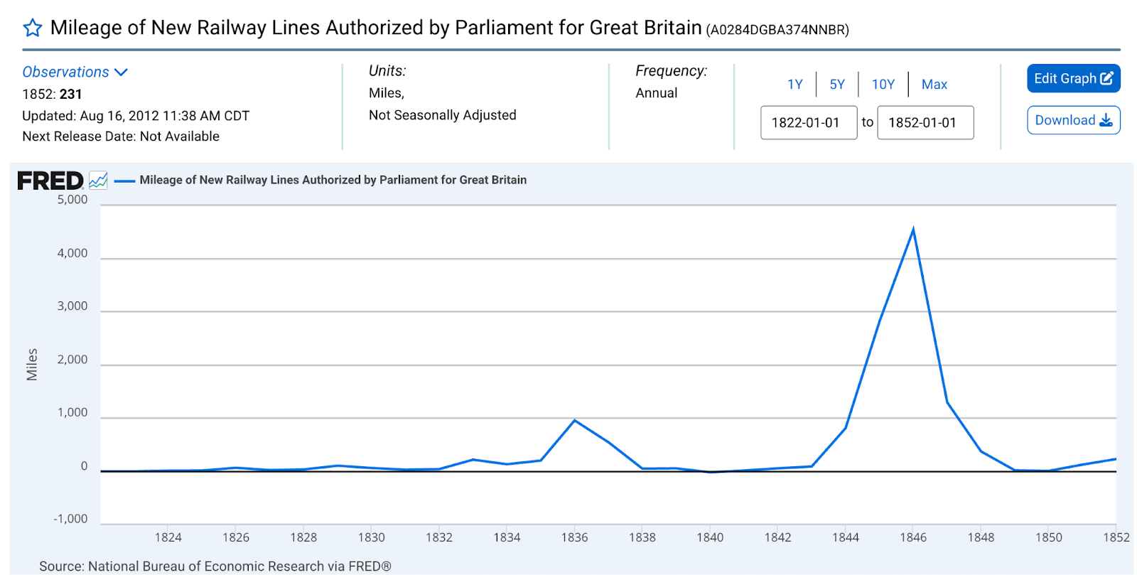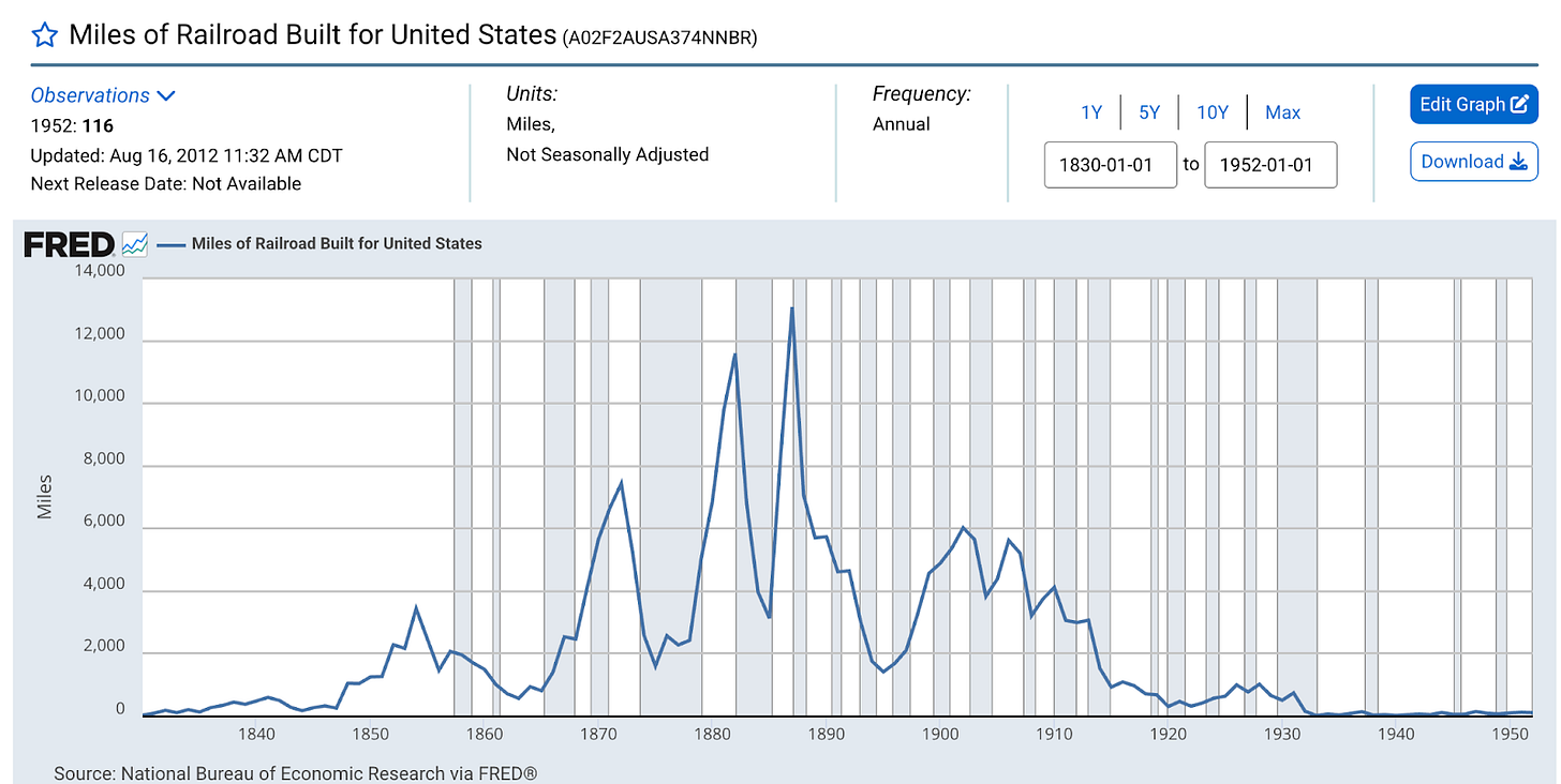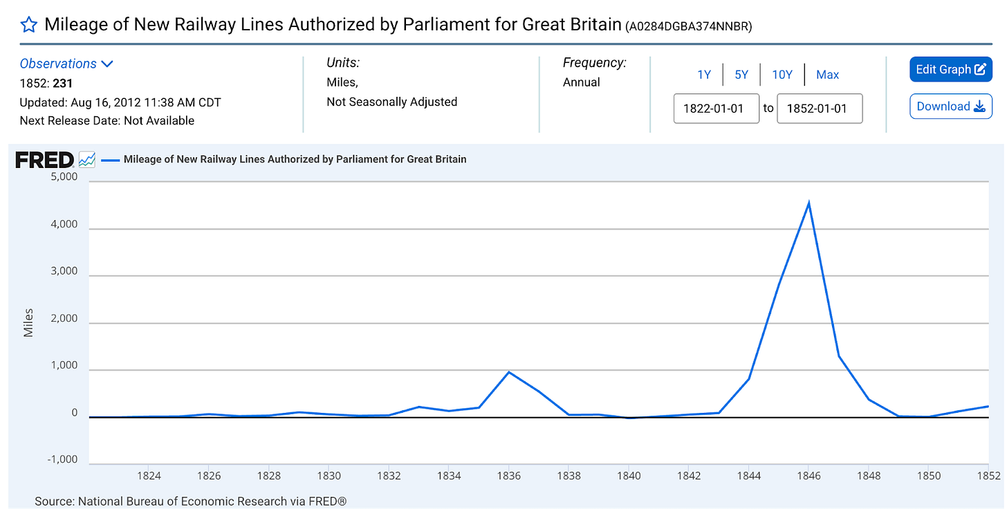 Source: Federal Reserve Economic Data (FRED), Federal Reserve Bank of St. Louis. “Mileage of New Railway Lines Authorized by Parliament for Great Britain.” National Bureau of Economic Research https://fred.stlouisfed.org/series/M04058AUSM346NNBR