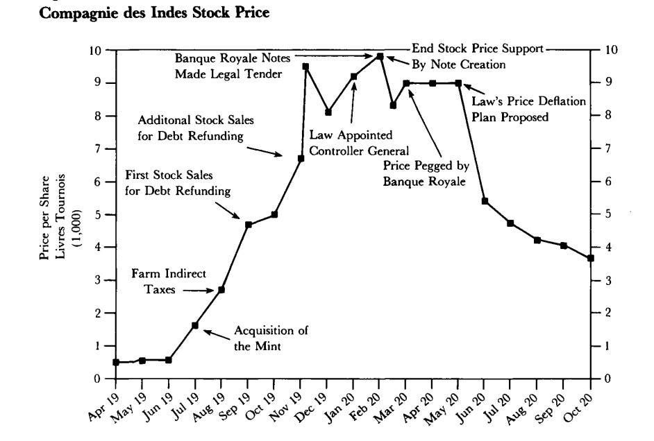 Then the stress test hit, not because Louisiana “wasn’t real,” but because holders tried to turn paper profits into gold/silver, and the system revealed what it actually was: confidence plus refinancing. Metallic payments were restricted, banknotes were elevated to legal tender, and then came the decisive move: a share-price peg at 9,000 livres, where the Banque Royale stepped in and exchanged its notes for company stock: printing money to buy the stock and keep it from falling. Once you’re doing that, the price isn’t being discovered anymore; it’s being defended. And defending it required repeated, very large note issues to absorb selling pressure, which showed up where it always shows up: higher prices in the real economy. Researchers estimate average monthly inflation around 4% from Aug 1719 to Sep 1720, with a 23% spike in January 1720.
