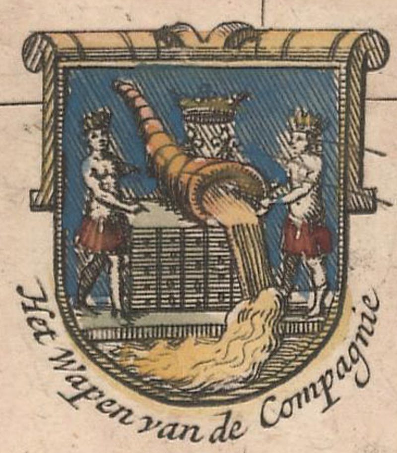 Exhibit 1: Mississippi Company Promotional Engraving Coat of arms depicting two Native Americans holding a golden horn of plenty from which the Mississippi River flows.