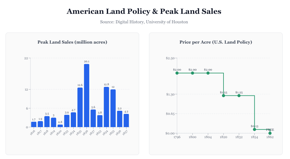 Exhibit 5: American Land Policy & Peak Land Sales Chart (1790s-1850s) Dual chart showing peak land sales in million acres (left) and price per acre in U.S. Land Policy (right). Peak sales reached 20+ million acres in 1836 before the collapse.