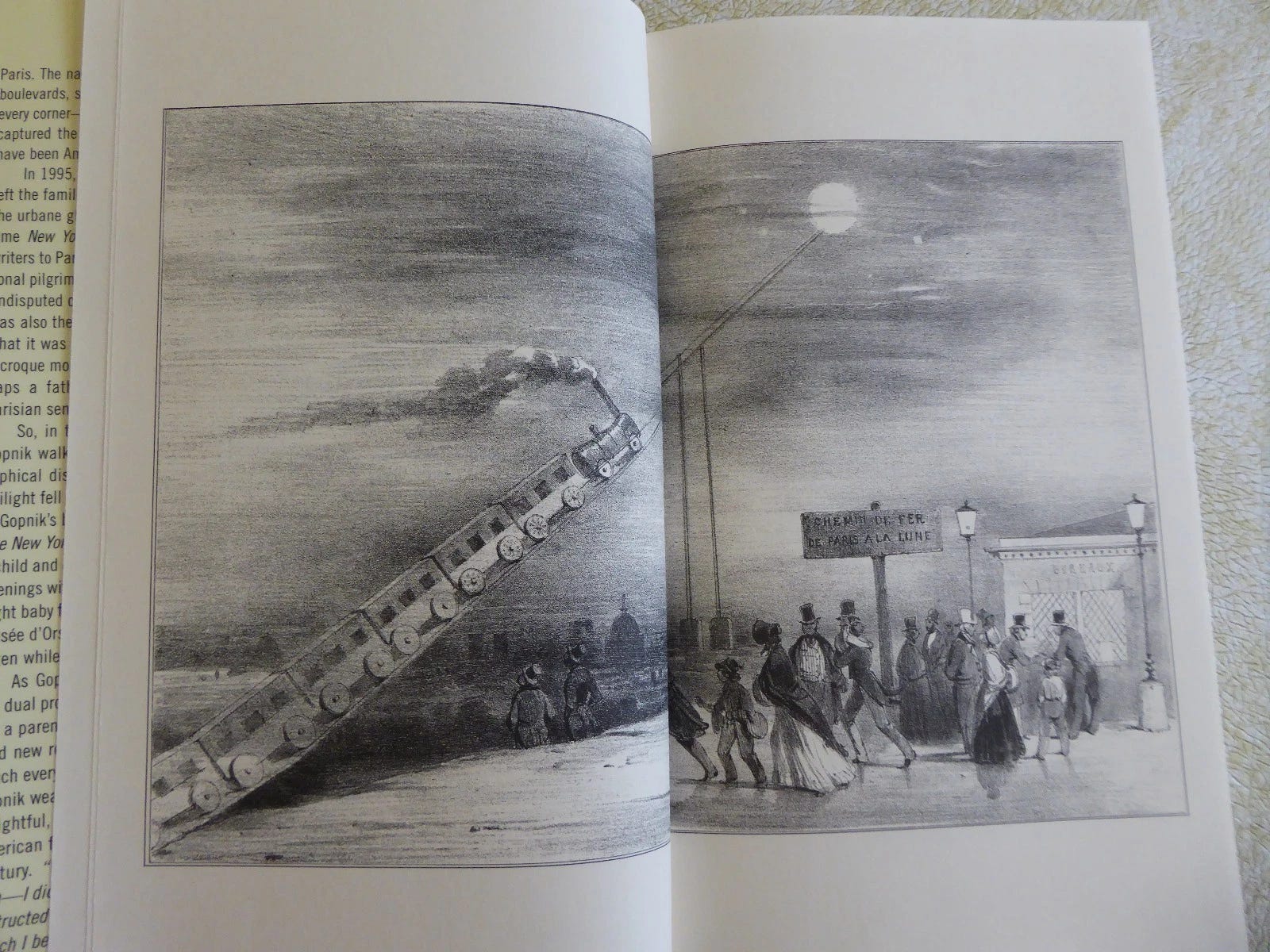 I read an essay collection called Paris to the Moon years ago and filed that image away as peak French whimsy: modernity, optimism, all of it. Only later did it click: the “train to the moon” cartoon isn’t really about romanticism. It was a satire about British railway stock mania at the time, about how easily we price the destination before the tracks exist, and how normal it feels from the inside.