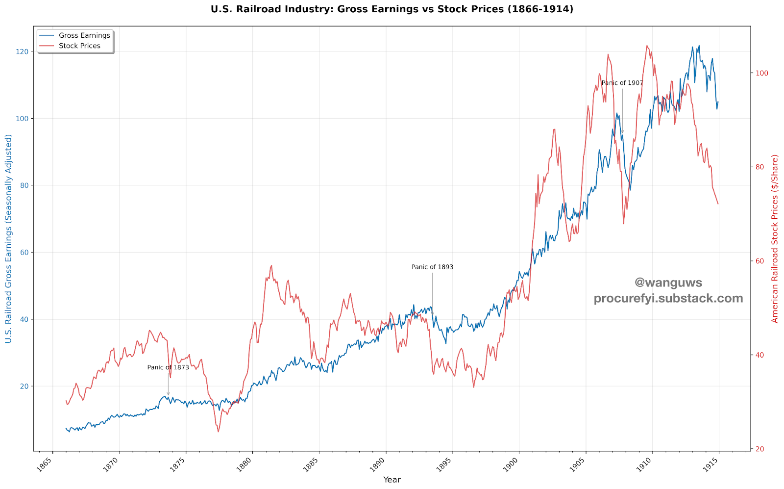 Exhibit 11: U.S. Railroad Industry: Gross Earnings vs Stock Prices (1866-1914) Dual-axis chart comparing U.S. railroad gross earnings (blue line, left axis, monthly averages) with American railroad stock prices (red line, right axis, indexed). Shows steady 16× growth in earnings from ~$7.3M/month (1870) to ~$114.8M/month (1914), while stock prices experienced at least six distinct boom-bust cycles including crashes in 1873, 1893, and 1907. Demonstrates divergence between operational success and market speculation.