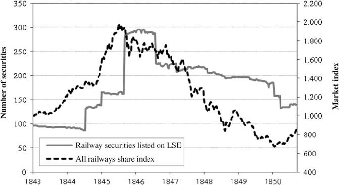 Exhibit 8: Railway Securities Listed on LSE and All Railways Share Index (1844-1850) Dual-axis chart showing the number of railway securities listed on the London Stock Exchange (solid line, left axis) rising from ~100 in 1843 to ~300 by 1845, while the All Railways share index (dashed line, right axis) peaked around 1,900 in late 1845 before collapsing to ~600 by 1850.