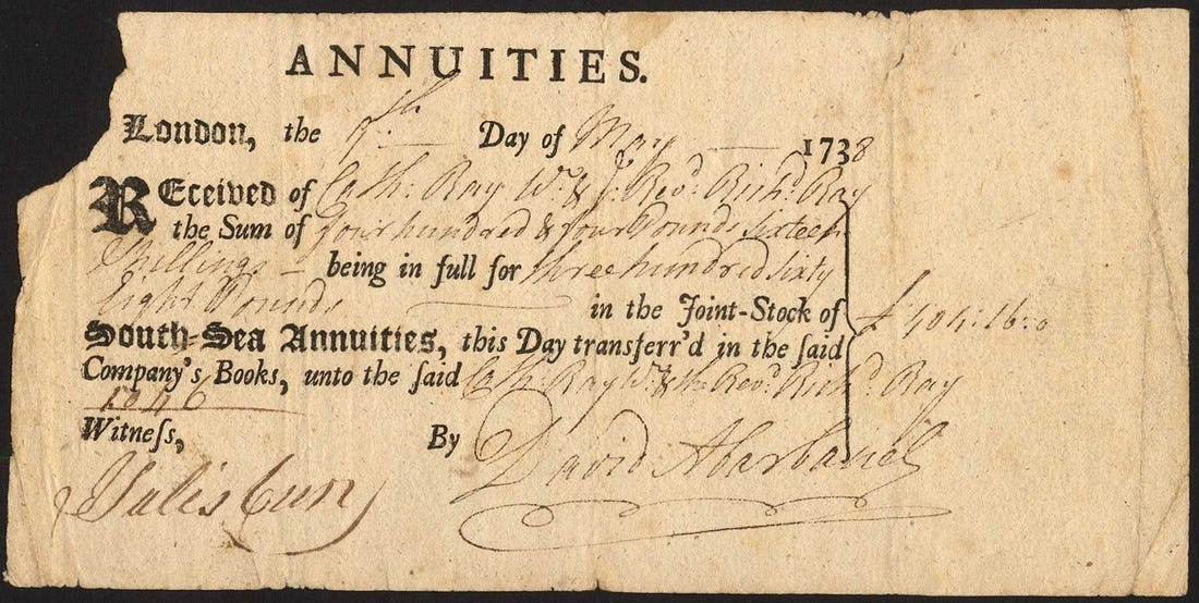 Britain runs the same play, just with less colonial fantasy and more explicit financial engineering. The South Sea story people remember is “trade with South America.” The story investors actually bought was: refinance the British state permanently. After years of war, Britain was sitting on a messy stack of government obligations - redeemable bonds, long annuities, short annuities. The South Sea Company offered to bundle a large share of that debt into a single corporate balance sheet. If you could consolidate public debt inside one company with Parliament’s blessing, then in theory you could lower the state’s funding costs, skim the spread, and turn government liabilities into a rising equity asset.