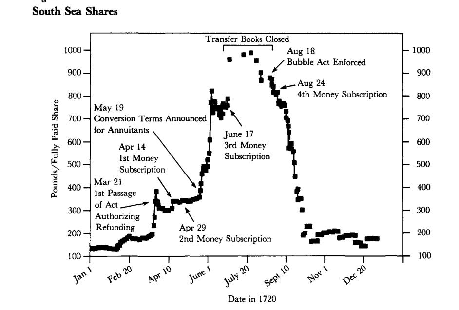 Then liquidity tightened and investors started needing cash. The whole structure reversed. Britain didn’t stop being Britain, and public credit didn’t suddenly become worthless. What failed was the assumption that refinancing would always be available. When that window closed, installment buyers became forced sellers and loans against stock turned into margin calls. In weeks, South Sea shares collapsed: from ~£775 at the end of August to ~£290 by early October.