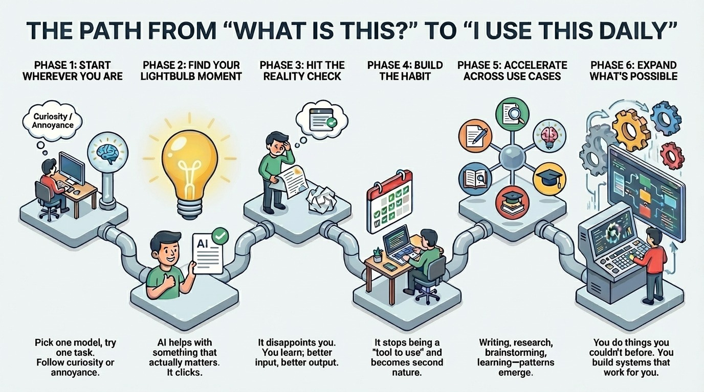 Learning AI isn’t about taking a course and then “knowing it”. It’s a gradual shift in how you think and work. Here’s what that progression usually looks like:
