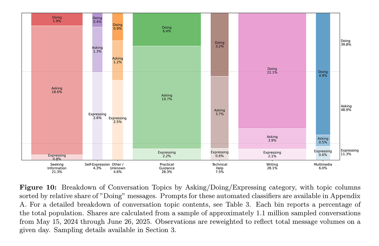When you zoom in, most conversations fall into three big buckets: Asking, Doing, and Expressing.