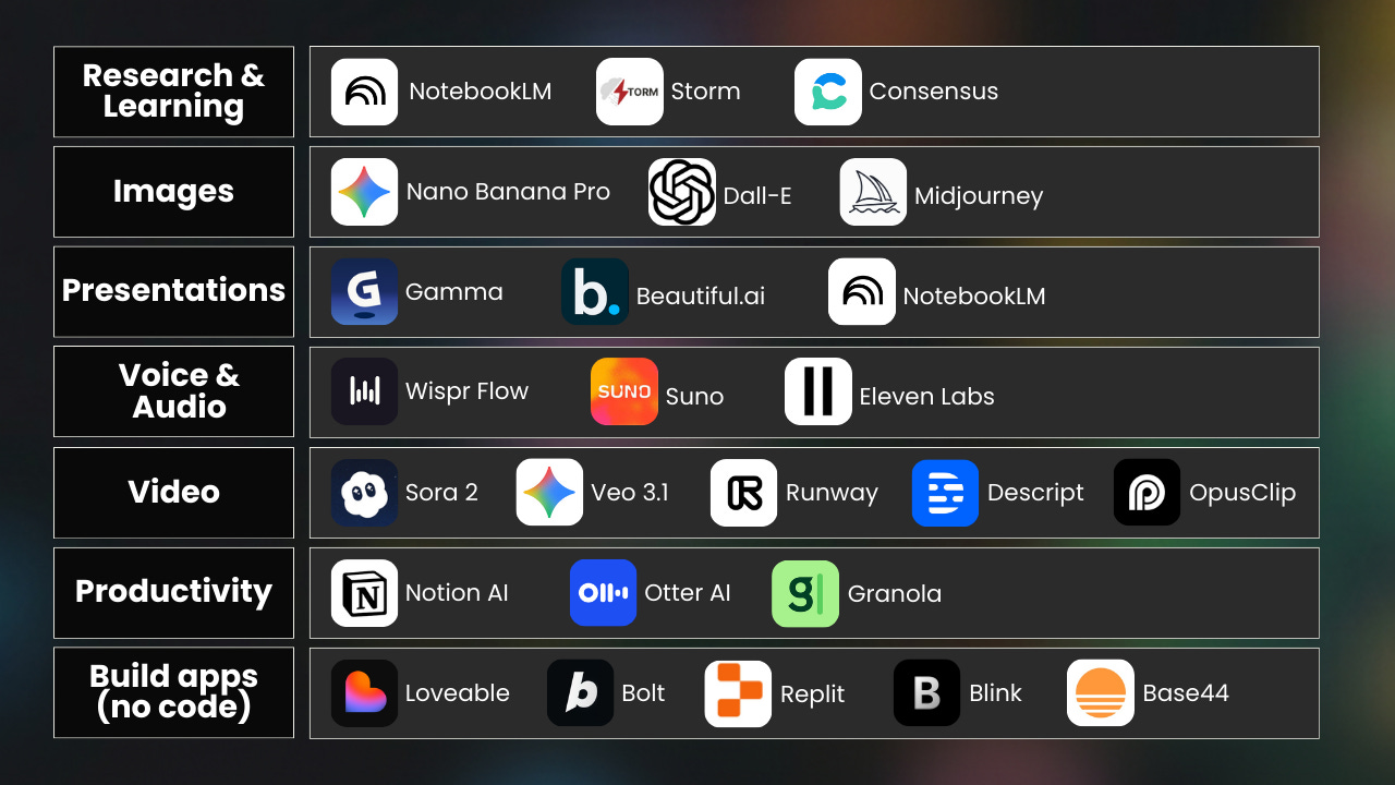 Besides the major AI models, tools have come out like mushrooms after rain. And many apps you might already use (like Canva or Notion) now have AI built in as well.