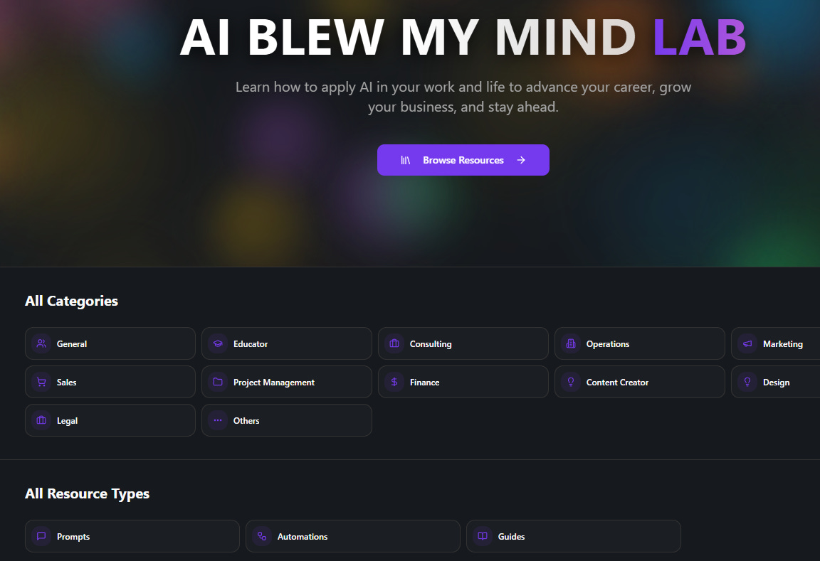 AI blew my mind LAB - A practical resource library with prompts, tools, automations, and step-by-step guides for using AI in your work and life. Built for any level and any role, so you can learn on your own terms.