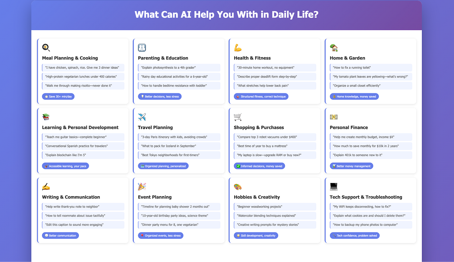 Pick any general-purpose AI model. ChatGPT, Claude, Gemini, doesn’t matter which. Start with something you don’t enjoy doing and could use help with, or just follow your curiosity. There’s no wrong entry point.