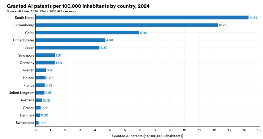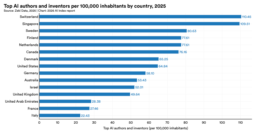 The AI Index did surprise me on one front. Switzerland has ranked first in the world for AI researchers and developers per capita, according to the 2026 AI Index Report published by Stanford University’s Institute for Human-Centered Artificial Intelligence, reinforcing its position as one of the world’s leading environments for artificial intelligence talent and adoption.