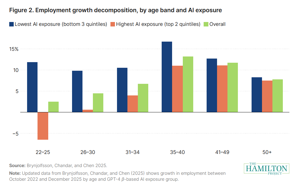 They continue: “They found employment fell more for young workers in occupations with higher AI exposure but not in occupations with lower AI exposure; differences in employment changes by occupational AI exposure for older workers were minimal. They found employment fell more for young workers in occupations with higher AI exposure but not in occupations with lower AI exposure; differences in employment changes by occupational AI exposure for older workers were minimal (figure 2).”