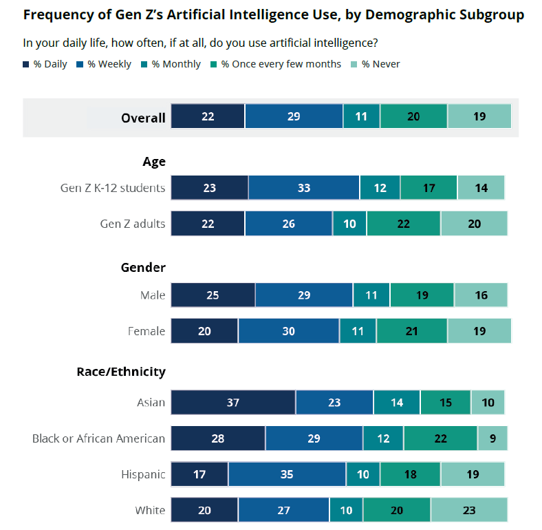 Six in 10 Asian Gen Zers and nearly as many Black Gen Zers (57%) use AI on at least a weekly basis, compared with about half of their White (47%) and Hispanic (52%) peers. Almost one in four GenZ white Americans among K-12 students never uses AI.