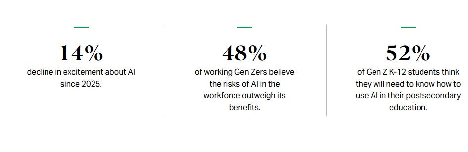 Young people aren’t excited, and many are forced to be curious, not by choice but by occupational necessity. The tech for the most part isn’t augmenting their future prospects, and they don’t trust it (sorry Ethan Mollick).