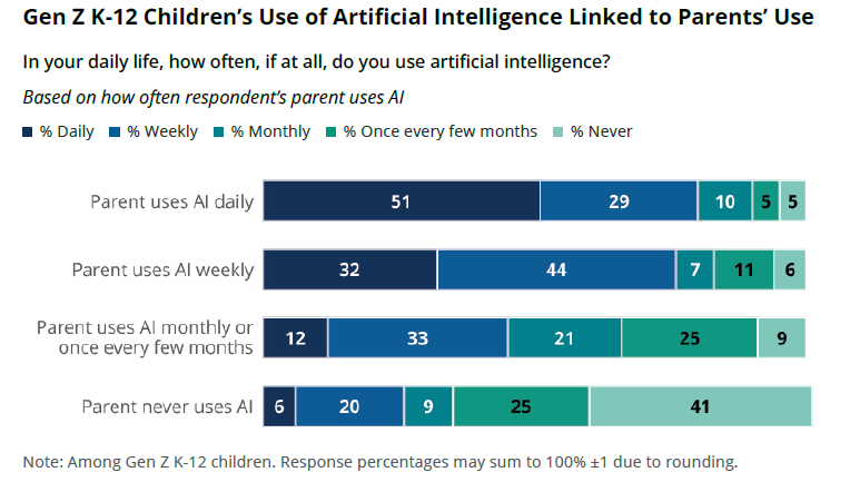 The extent to which Gen Z K-12 students use AI is closely tied to parental use. Frequent parental use is associated with significantly higher daily and weekly use among their children, while children of non-users are far more likely to report infrequent or no use.