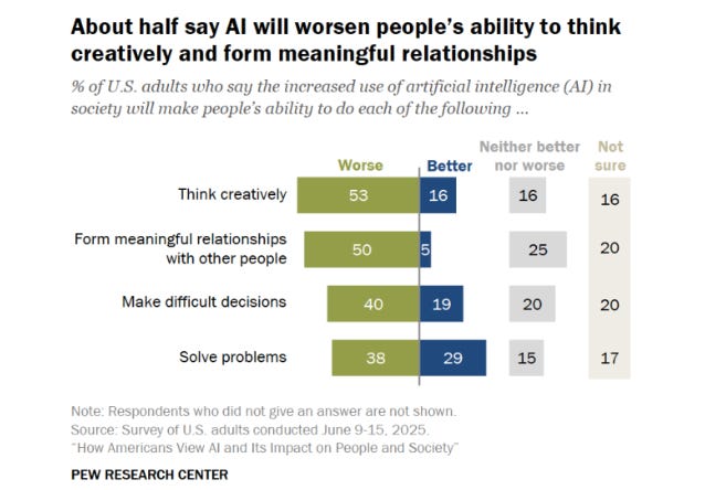 This isn’t just marked skepticism, this is becoming the foundation for a future Anti-AI movement. If we aren’t caring for our young people and their needs, what sort of society are we even planning for? Gen Z remains skeptical of AI’s positive impact on core skills and productivity, but are even more worried about its impact on their relationships, connections, identity, sense of meaning and future job prospects.