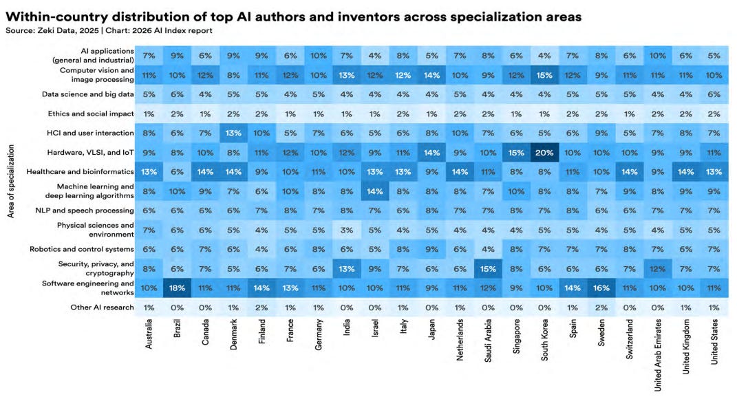 Singapore is good in Computer Vision, South Korea is good in Hardware. Denmark is good in Healthcare. Israel is good in Machine Learning. U.S. is good in Software Engineering, Australia is good in Bioinformatics, fairly interesting to think about.