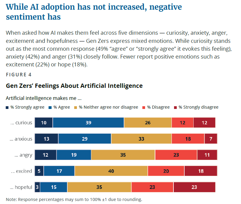 “The excitement (22%) and hopefulness (18%) that Gen Zers feel about using AI were already low last year and declined sharply this year, while anger (31%) increased and anxiety (42%) remained steady.”