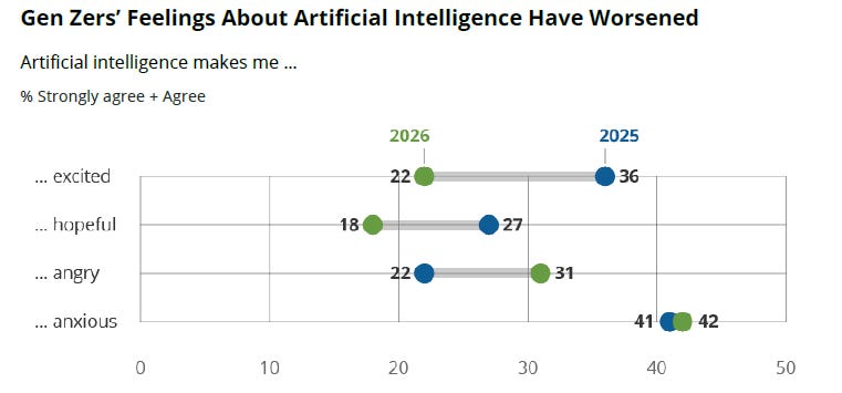 2026 is the year then that American GenZ negative sentiment toward AI has markedly increased. Why do you suppose that is?