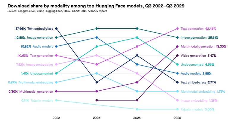 Over 5% of LLM Downloads had to do with Video generation in the 2022 to 2025 period on Github, rising rapidly in 2025.