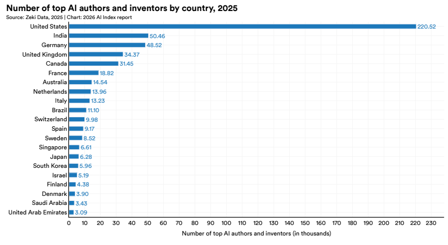 “In 2025, the largest share of identified AI authors and inventors came from the United States (220,520), followed by India (50,460) and Germany (48,520) (Figure 1.8.1). The United Kingdom (34,370), Canada (31,450), and France (18,820) formed a second tier with Australia, the Netherlands, Italy, Brazil, Switzerland, and others making up the broader distribution of contributors.”