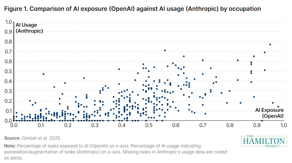 “Importantly and somewhat confusingly, there are now numerous AI exposure and usage measures being used in AI research, and they do not entirely agree. AI exposure and AI usage are different concepts, and many occupations rank differently on exposure than on usage, as shown in Gimbel et al. (2025; figure 1).” - Source.