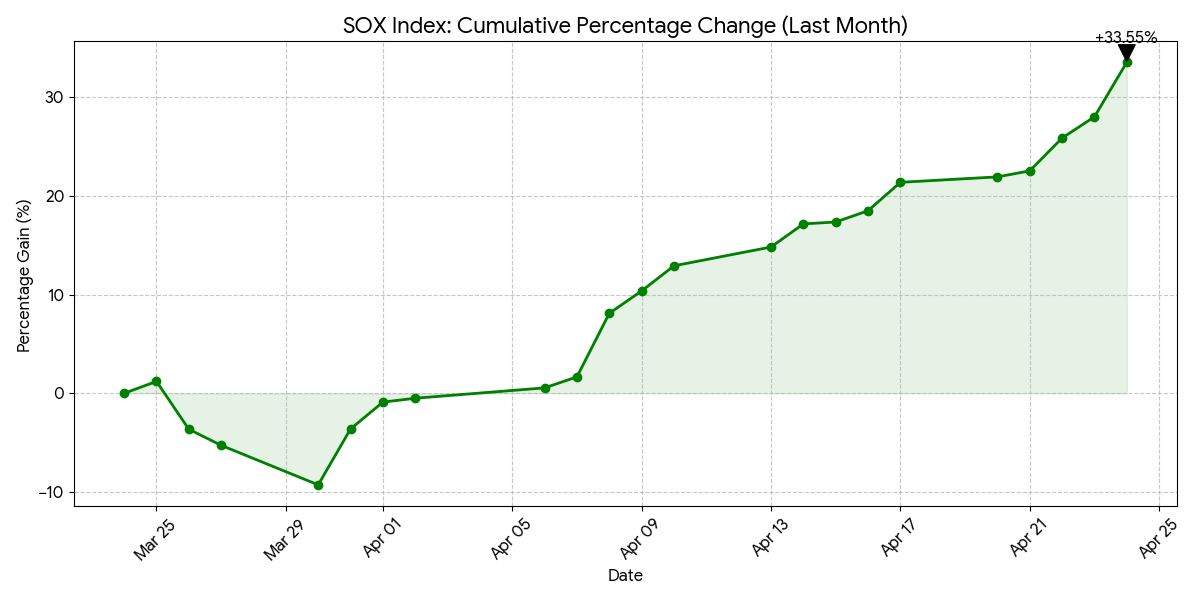 In a Semiconductor boom without precedent. It’s the longest winning streak on record. The index tracks the universe of semiconductor companies. After a brief dip in late March (bottoming out at 7,142.33 on March 30), the index began its historic 18-day climb, resulting in the parabolic growth seen in April, 2026.