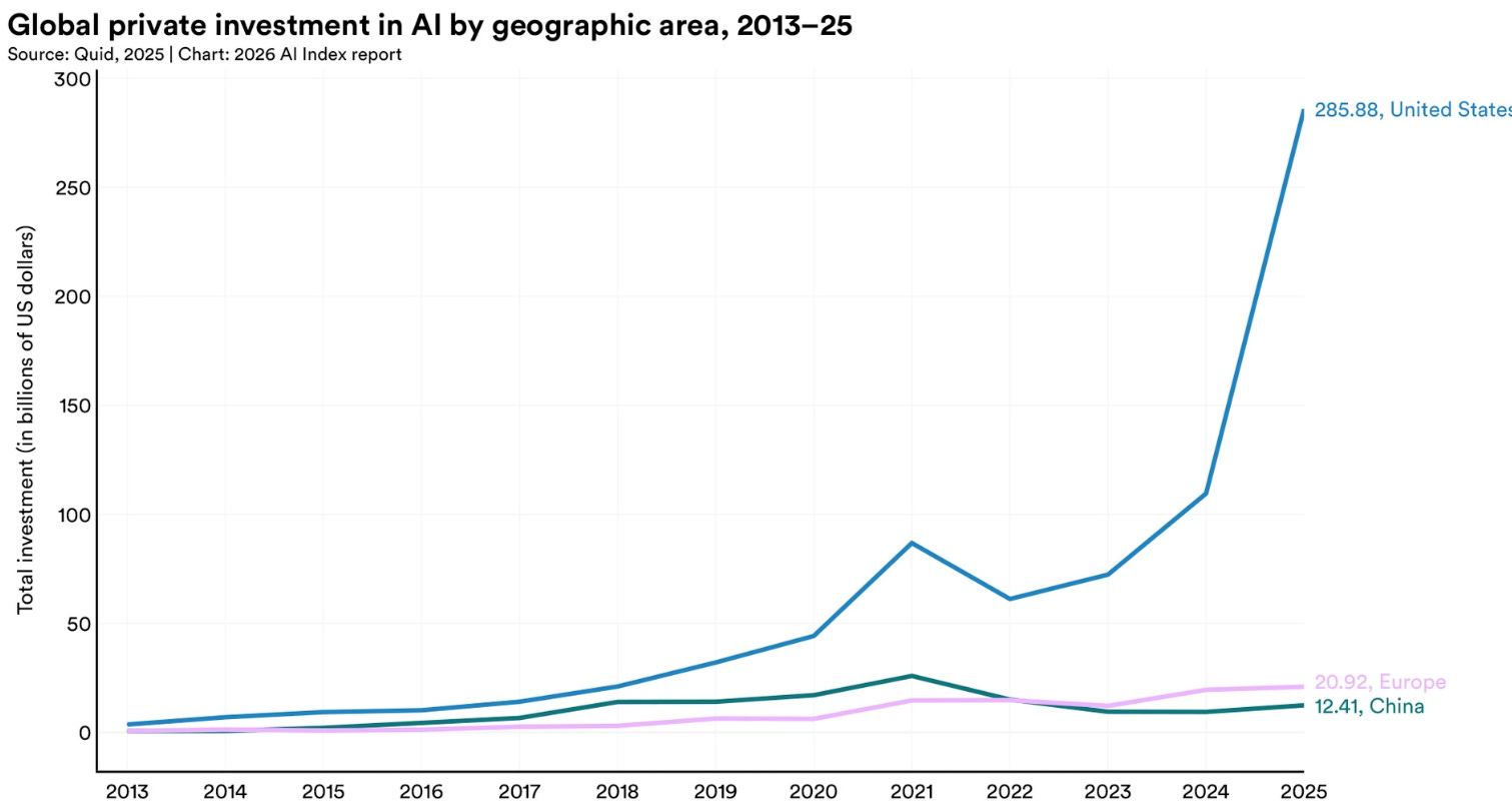 U.S. Lead in Venture Capital Private Investments in AI is Significant 2013 to 2025: