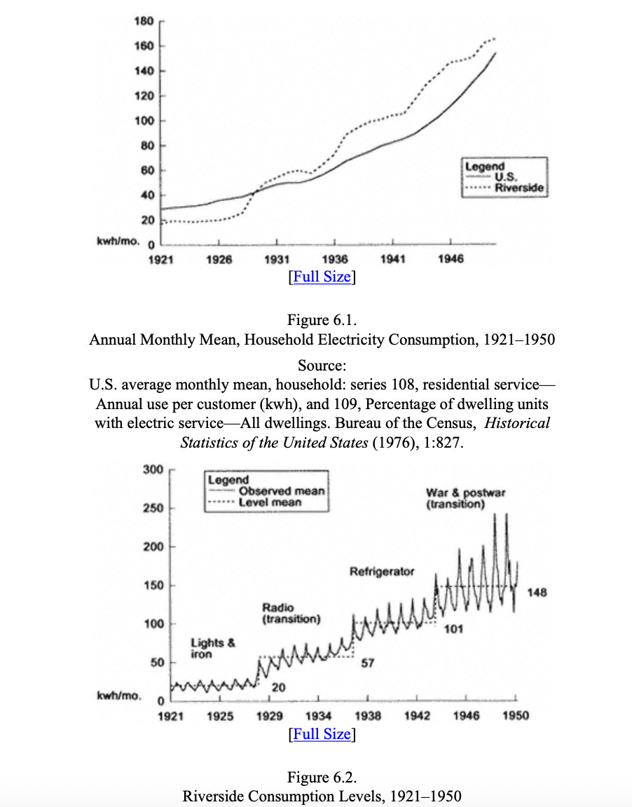Riverside Consumption Levels, 1921-1950 Detailed consumption chart showing how new appliances drove electricity usage: âLights & Ironâ (~20 kwh/mo), Radio transition period (~57 kwh/mo by 1929), Refrigerator adoption (~101 kwh/mo by 1938), and War & power transition reaching ~148 kwh/mo by 1946.