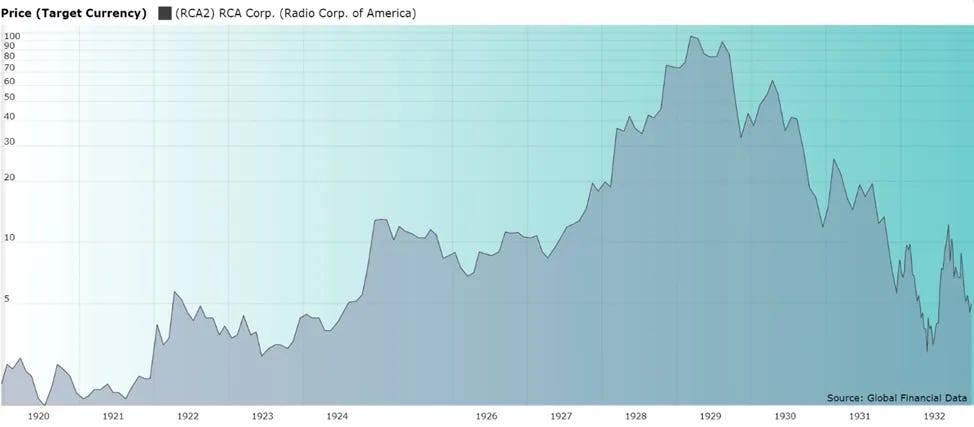 Then comes the regime change. Once stock prices start falling, collateral falls with them. Brokers and lenders pull back. Margin turns from accelerant into trap. RCAâs stock, split adjusted, traded around $5 in 1922, hit $113 at a point in 1929, and was back around $2.5 in 1932. Even after the crash, parts of the real radio business kept growing. Advertising dollars rose into the early 1930s. But the stock had already done its job in the market cycle. The trade was priced for perfection and financed for momentum. Once the financing window narrowed, the market stopped paying âend stateâ prices for medium-term progress.