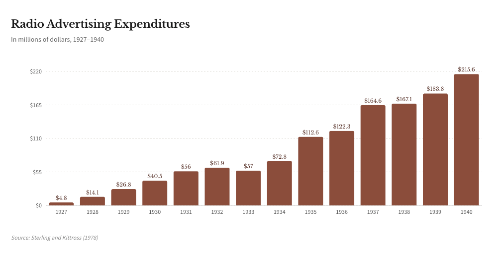 Radio is another clean example of how a real transformation can still produce a classic, levered equity blow-off. The technology was genuinely new, adoption was compounding fast, and the buildout required real capital. Factories had to be expanded, parts supply chains had to be built, and thousands of households adopted radio equipment as utility. Radio advertising was tiny in the late 1920s, then rose fast: $4.8M (1927), $14.1M (1928), $26.8M (1929), $40.5M (1930), $56.0M (1931), $61.9M (1932), and it kept growing into the late 1930s.