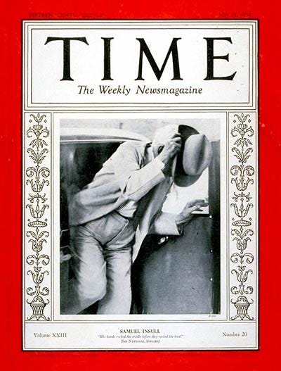 Exhibit 14: TIME Magazine Cover - Samuel Insull TIME Magazine cover featuring Samuel Insull dated May 14, 1934, after his utility empireâs collapse and subsequent indictment. Captures the transformation from âutility kingâ to cautionary tale.