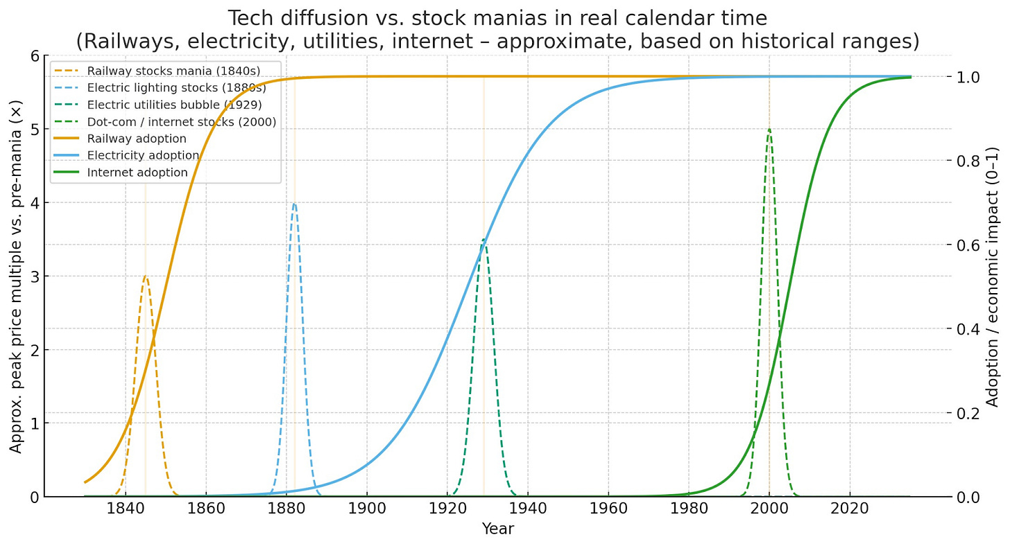 The people who underwrote railroad bonds and bought RCA at the top were usually right about the direction of history. The future they believed in arrived. It just didnât arrive on the timeline their leverage demanded. So the question in any boom isnât whether the technology is transformational, it usually is. The question is whether youâre still in the phase where that matters.