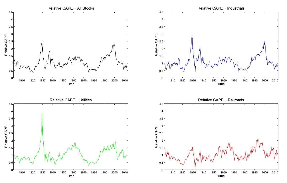 Valuations reflect how far this logic was carried. The Utilities sector cyclically adjusted price-to-earnings ratio (CAPE), which smooths earnings over a 10-year real average, reached a record level just above 60 in Q3 1929. Barronâs warned that summer about unrestrained speculation in utilities and an accelerating merger wave that far outpaced underlying economics.