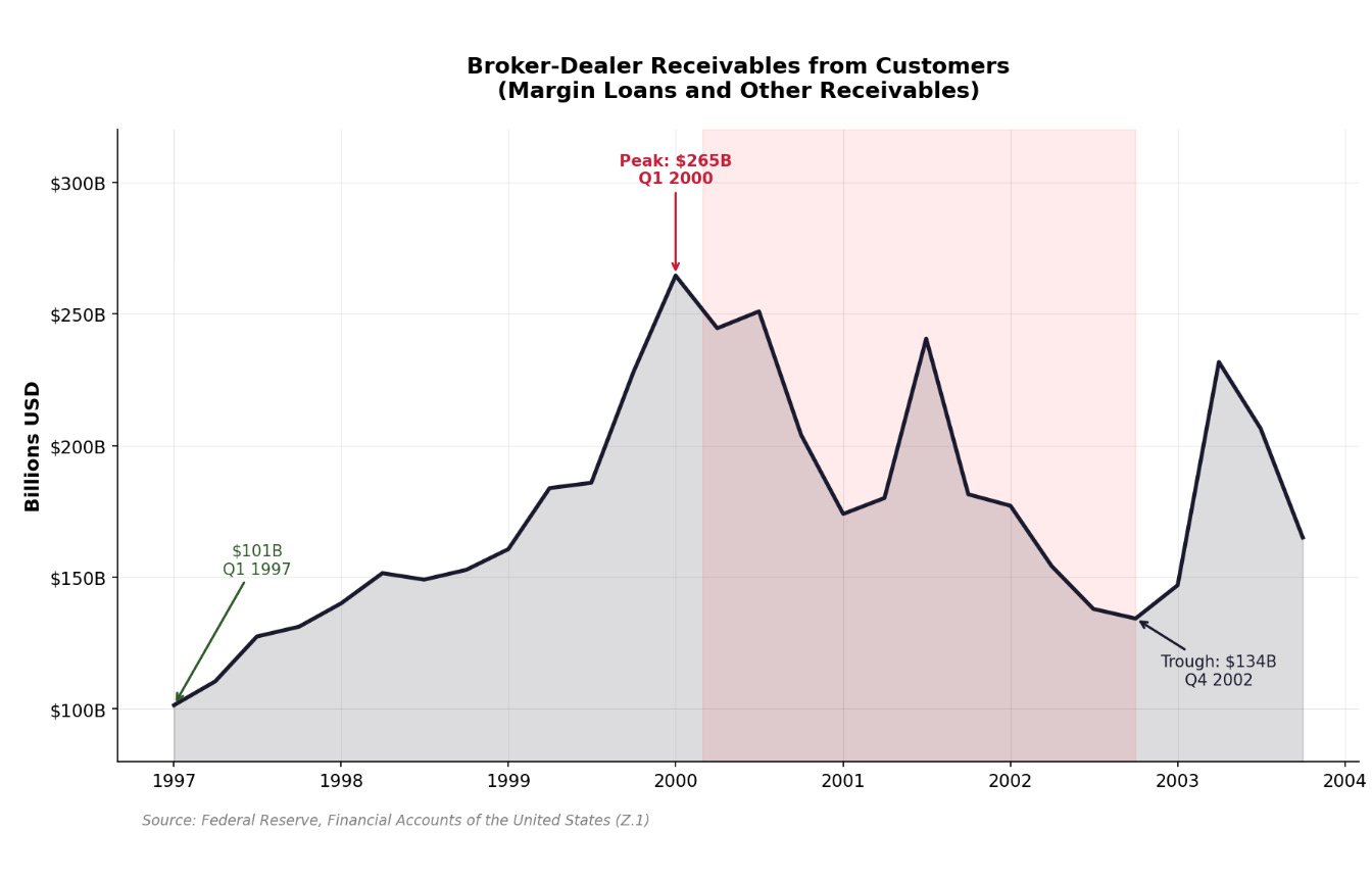 Exhibit 21: Broker-Dealer Receivables from Customers - Margin Loans and Other Receivables (1997-2004) Chart showing broker-dealer margin loans and customer receivables rising from ~$110B in Q2 1997 to peak of $263B in Q1 2000 (coinciding with NASDAQâs March 10, 2000 peak at 5,048)