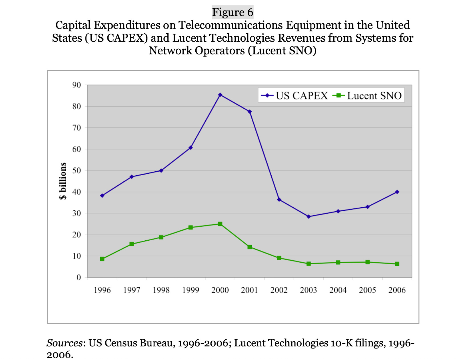 Exhibit 20: Capital Expenditures on Telecommunications Equipment in the United States (1996-2006) US telecom equipment capital expenditures rising from ~$40B (1996) to peak of ~$87B (2000), then collapsing to ~$37B (2002) before stabilizing at ~$40B (2006). Lucentâs SNO revenues tracked this pattern, climbing from ~$9B (1996) to ~$25B (2000), then plummeting to ~$7B (2003-2006).
