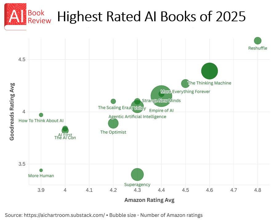 To be clear, all books have done very well to feature in this select group - they have all in their different ways made a dent in the AI debate. However the standout result is Empire of AI by Karen Hao , an excoriating behind the scenes account of OpenAI. This is easily the most rated book of the year both for Amazon and Goodreads (the scale above is logarithmic so the gaps are exponential!).