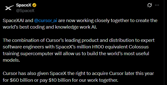 In a shocking turn of events, SpaceX is claiming a deal with Cursor giving it the right to acquire it for $60 Billion. Is that so?
