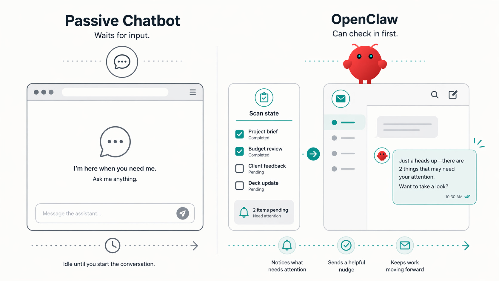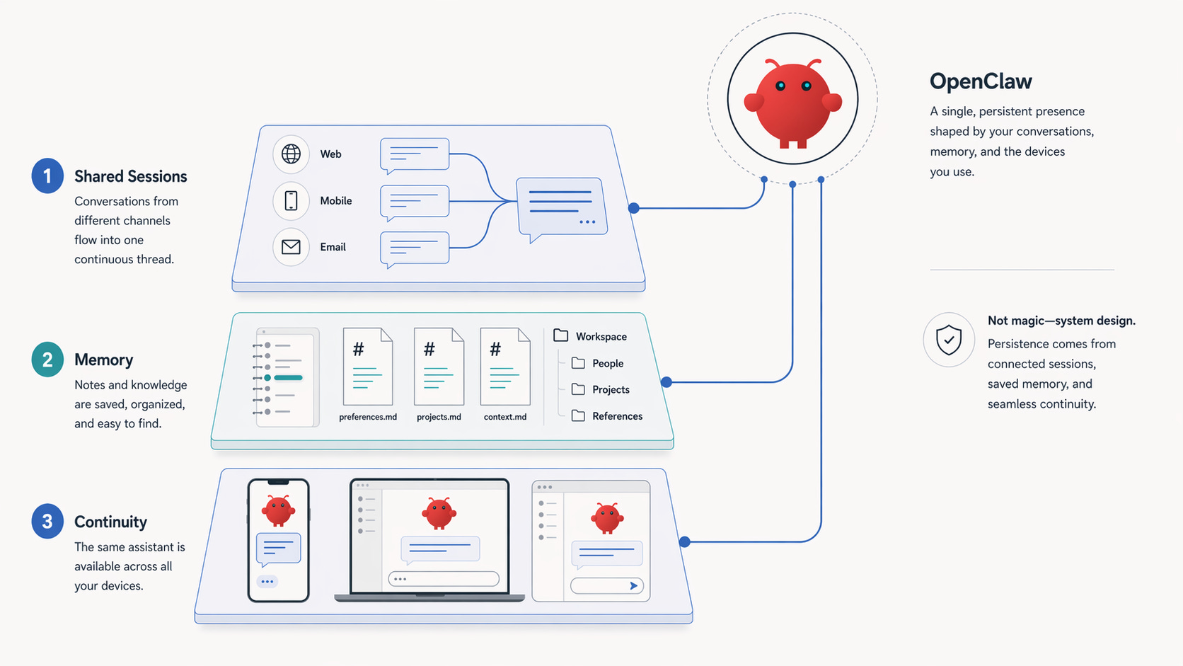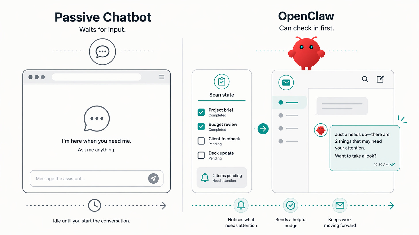 That does not sound dramatic until you think about what it means in practice. A chatbot waits. A heartbeat system makes lightweight proactivity possible. The assistant can review what is pending, notice that something needs attention, and sometimes reach out before you remember to ask. That is a bigger emotional shift than most AI writing acknowledges. The difference between passive and proactive is not mystical. It is about cadence, continuity, and permission to speak first.