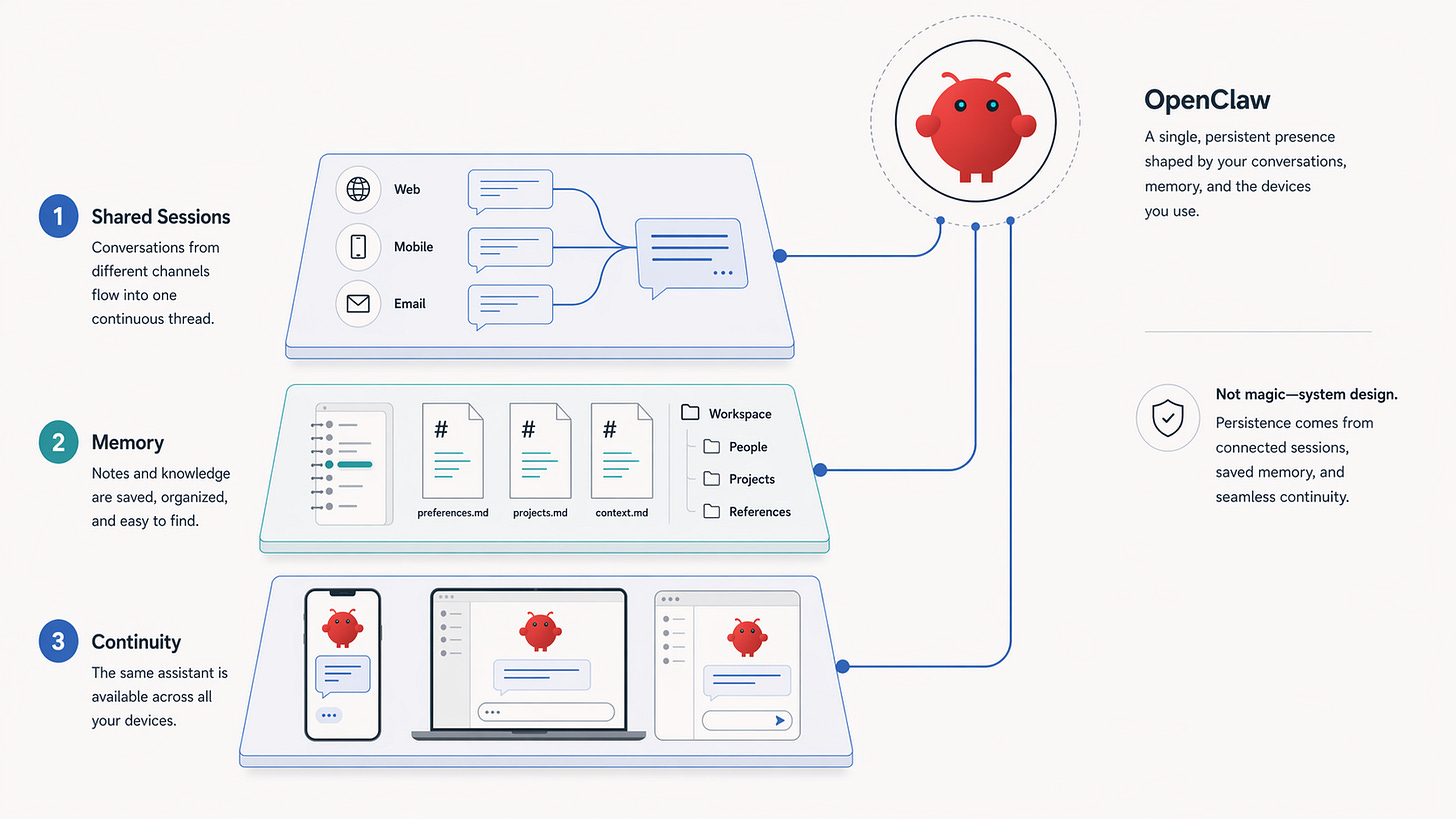Used more carefully, the metaphor helps. My read is that OpenClaw is starting to look like a lightweight coordination layer above the software you already use. The gateway owns sessions, routing, and channel connections. Memory persists in the workspace. Tools connect the assistant to files, browsers, messages, and devices. Nodes extend that behavior onto phones and other machines. Put together, that is not a new operating system in the literal sense. It is a thinner, more personal layer that makes software feel reachable through conversation instead of only through menus and app windows.