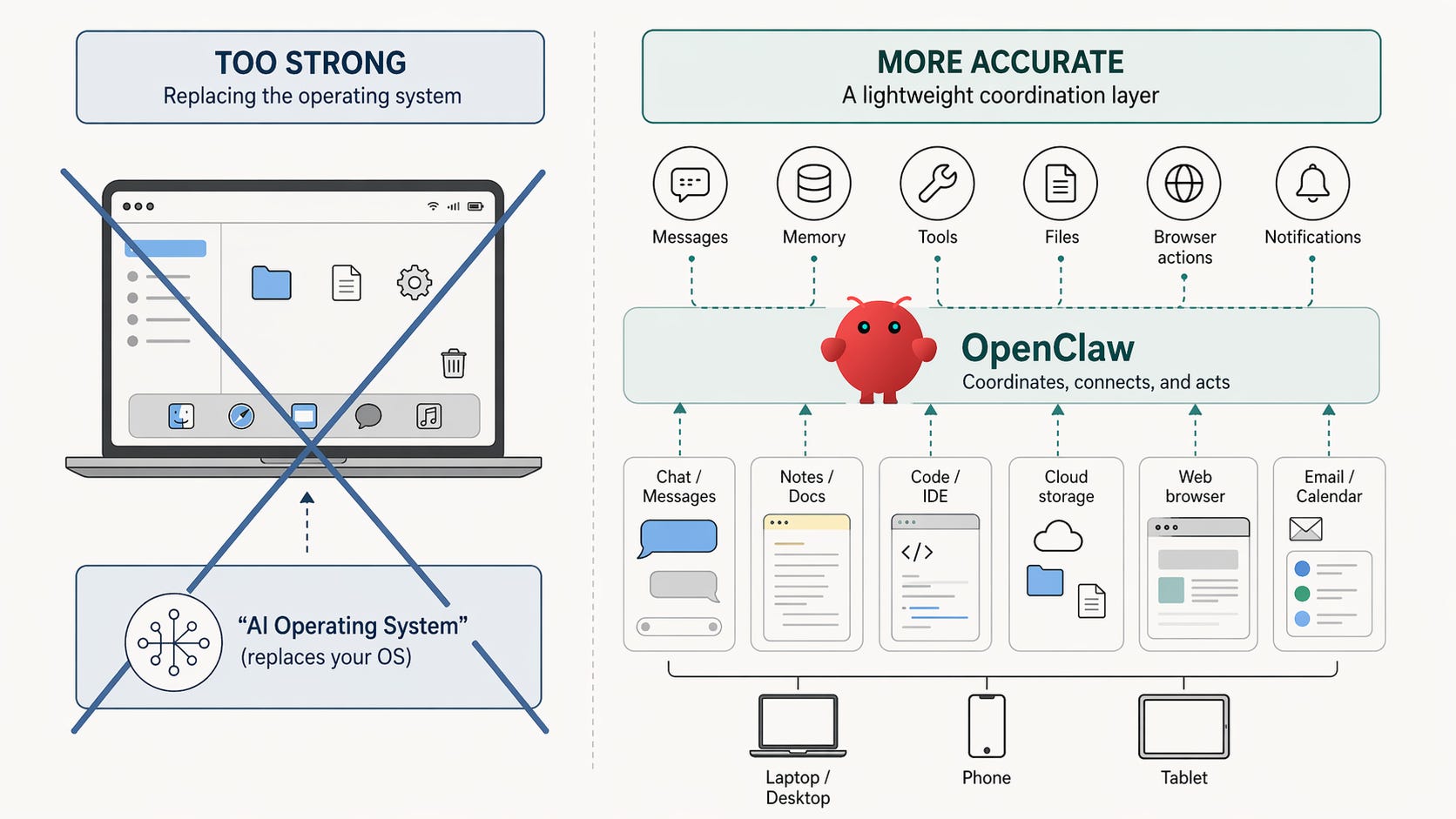 This is where the “operating system” language needs discipline. Taken literally, it is too strong. OpenClaw does not replace iOS, Android, macOS, or Windows. It does not own the hardware or the app model. If you say “new operating system” too loudly, it starts to sound like a slogan.